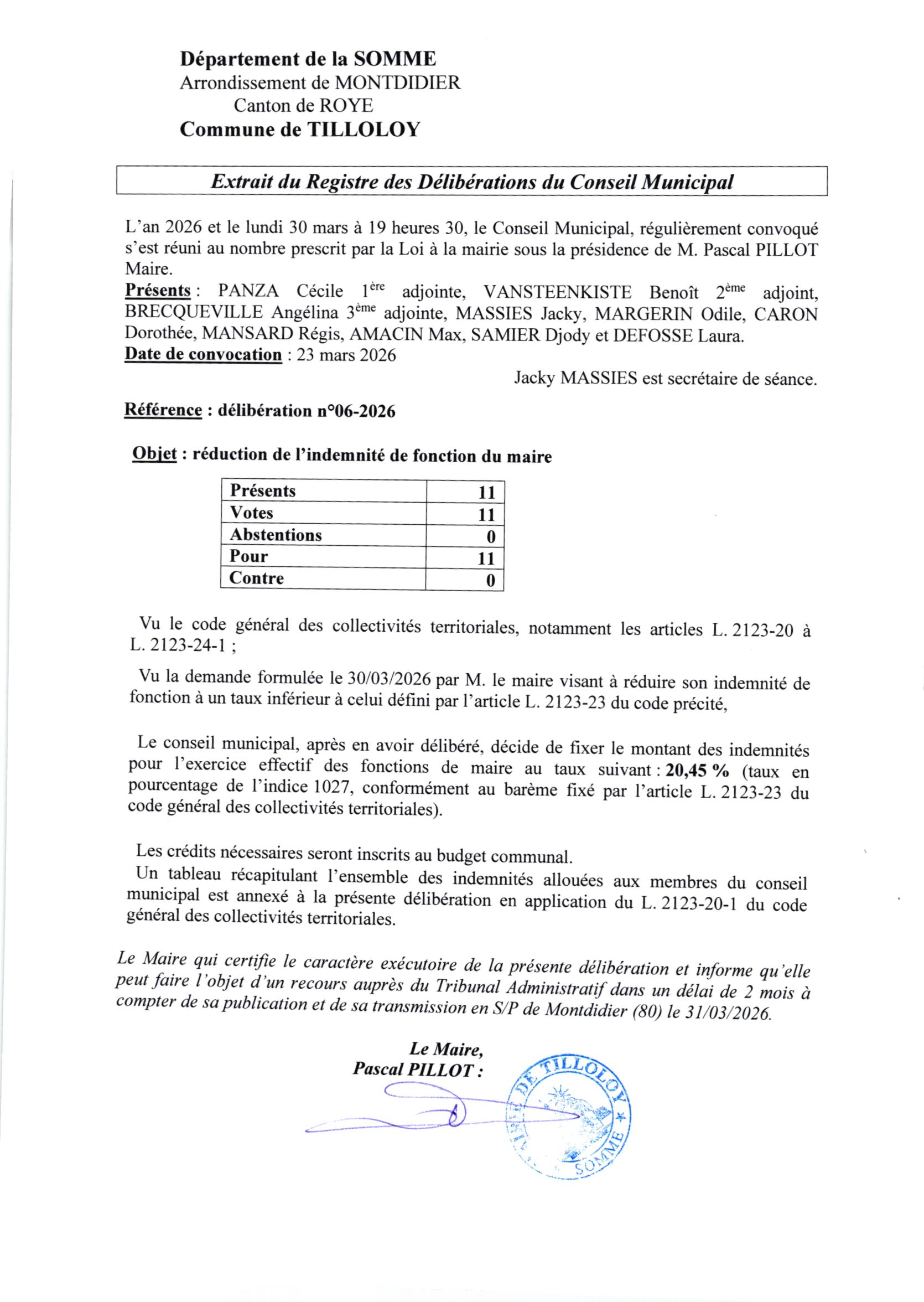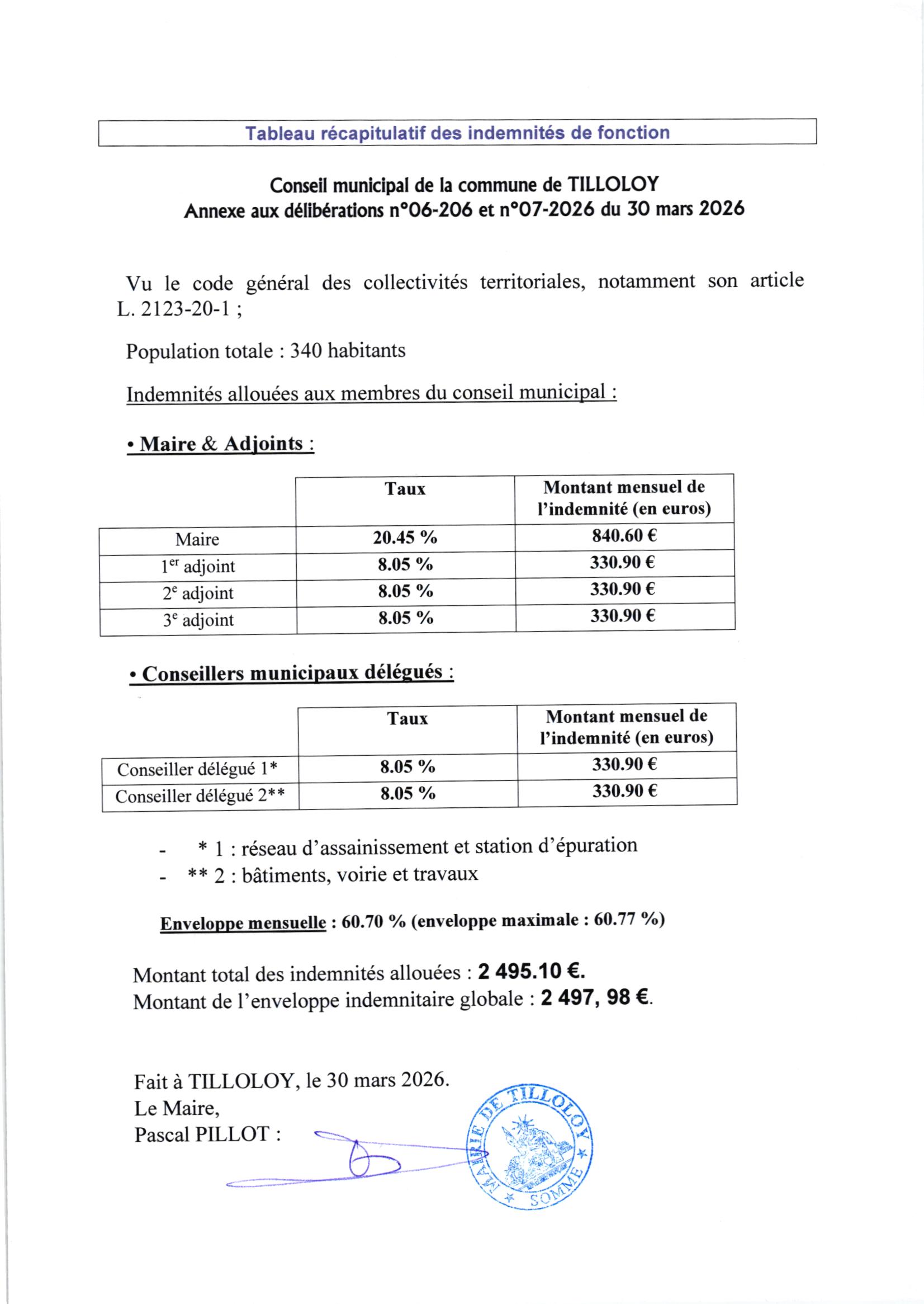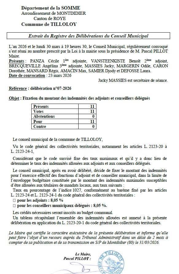 Indemnités du Maire : Cette indemnité est fixée par défaut au niveau maximal, soit pour Tilloloy à un montant brut/mois de 1 155.06 €. M. Pillot a formulé une demande visant à réduire son indemnité à 840.60 €. Le conseil, après en avoir délibéré, décide de fixer le montant des indemnités du maire au taux suivant : 20,45 % de l’indice 1027 soit 840.60 € brut/mois. L’indice 1027 est l’indice de référence pour le calcul des indemnités. Il correspond à un salaire de 4 110,52 € brut/mois pour un temps plein.Indemnités des 3 adjoints et des 2 conseillers délégués : M. le maire confirme qu’il a pris les arrêtés nommant Jacky Massies conseiller délégué pour l’assainissement & le suivi de la station d’épuration et Régis Mansard conseiller délégué chargé des bâtiments, de la voirie et du suivi des travaux.Le montant total des indemnités versées au maire, aux adjoints et aux conseillers délégués ne peut pas dépasser le plafond de 2 497.98 € brut/mois (commune de 100 à 499 habitants).Le montant maximal de l’indemnité d’un adjoint est de 447.64 € brut/mois. Mme Cécile Panza propose aux adjoints de réduire également le montant de cette indemnité afin de répartir l’enveloppe restante entre les 3 adjoints et les 2 conseillers délégués. Le conseil, après en avoir délibéré, décide de fixer le montant des indemnités au taux suivant : 8,06 % de l’indice 1027 soit 330.90 € brut/mois pour les 3 adjoints et les 2 conseillers délégués.