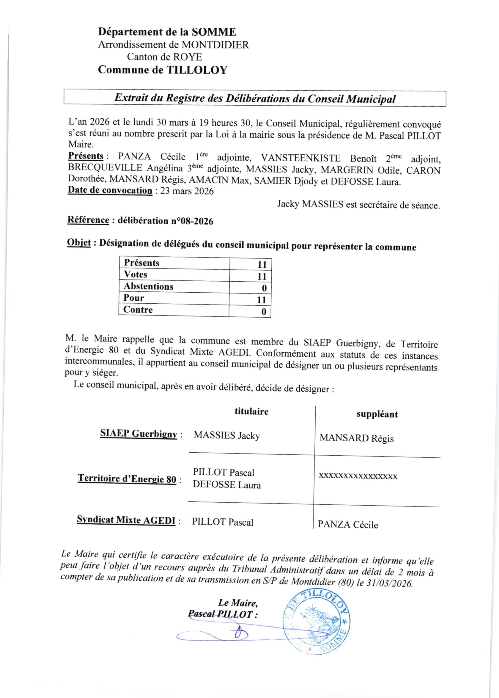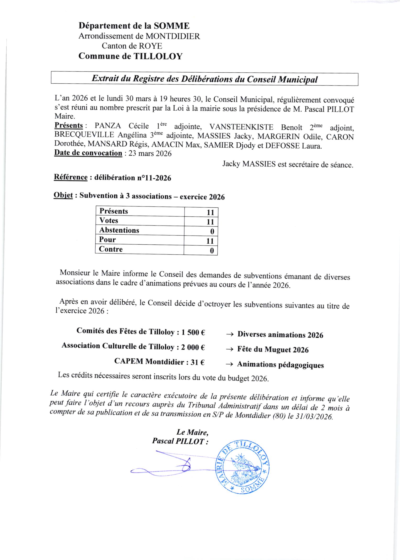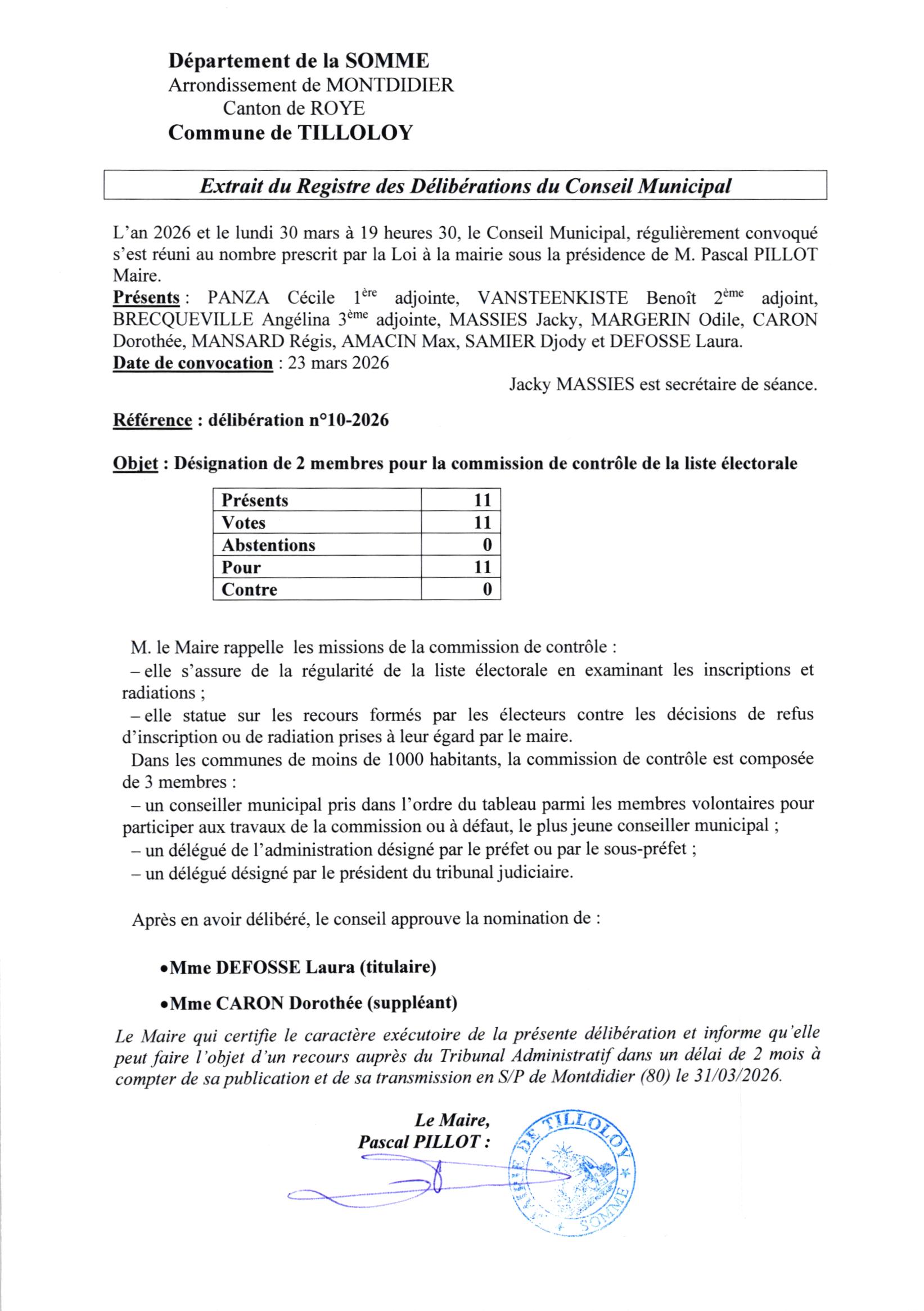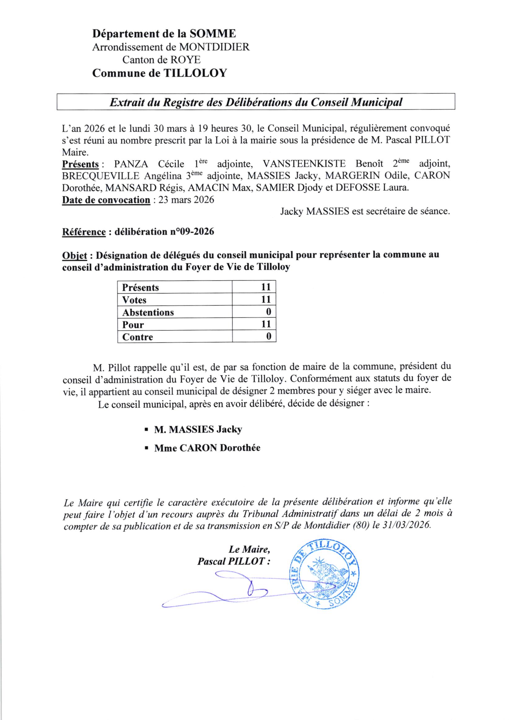 M. Pillot rappelle qu’il est, en tant que maire, président du conseil d’administration du Foyer de Vie de Tilloloy. Il appartient au conseil de désigner 2 membres pour y siéger avec le maire. Le conseil, après en avoir délibéré, décide de désigner Jacky MASSIES et Dorothée CARON.M. le Maire rappelle les missions de la commission de contrôle des listes électorales et rappelle qu’il faut choisir un membre du conseil pour siéger avec un délégué de l’administration désigné par le préfet et un délégué désigné par le président du tribunal judiciaire. Après en avoir délibéré, le conseil approuve la nomination de Laura DEFOSSE (titulaire) et Dorothée CARON (suppléante).Subventions : après en avoir délibéré, le Conseil décide d’octroyer les subventions suivantes au titre de l’exercice 2026 :- Comités des Fêtes de Tilloloy : 1 500 € - Diverses animations 2026